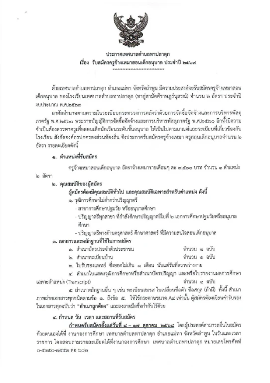 ประกาศเทศบาลตำบลทาปลาดุก เรื่อง รับสมัครสอบคัดเลือกพนักงานเทศบาลตำแหน่งประเภททั่วไป เพื่อแต่งตั้งให้ดำรงตำแหน่งประเภทวิชาการ ด้วยเทศบาลตำบลทาปลาดุก อำเภอแม่ทา จังหวัดลำพูน จะดำเนินการสอบคัดเลือก พนักงานเทศบาลตำแหน่งประเภททั่วไป เพื่อแต่งตั้งให้ดำรงตำแหน่งประเภทวิชาการ ระดับปฏิบัติการ จำนวน 1 อัตรา